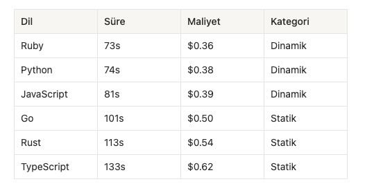 Dinamik diller ile statik tipli diller arasında 1.4 ila 2.6 kat fark. Hem sürede hem maliyette. Bu fark neden önemli? Çünkü AI ile geliştirme iteratif bir süreç. Her döngüde biriken küçük farklar, günün sonunda ciddi bir zaman ve para kaybına dönüşüyor.